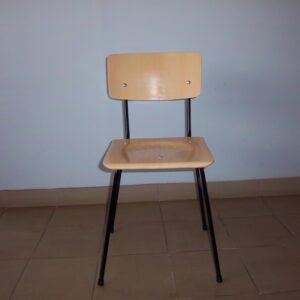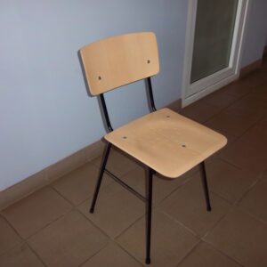 Scaun cu schelet metallic robust,prevazut cu protectie pentru pardoseala,vopsit in culoare neagra ( la cerere si alte culori). Sezut si spatar din lemn stratificat lacuit culoare natur. Se poate utiliza in sali de asteptare,sala de mese,sala de sedinte,etc. Produs romanesc.